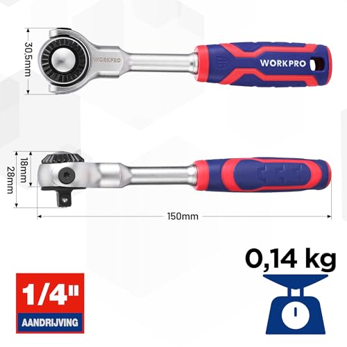 Met 72 tanden: WORKPRO ratelsteel set met 72 tanden van elke ratelsteel. Meer arbeidsbesparend en handig in gebruik. De steelkop van de ratel kan van richting veranderen tot een zwenkboog van five°