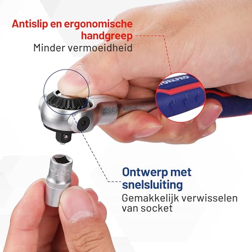 WORKPRO draaikopratel 72 tanden, 1/4” dopsleutelgreep met flexibele kop, 270°-draaibare ratel met 72 tanden, dopsleutel met snelsluiting voor het hanteren van reparatieapparatuur