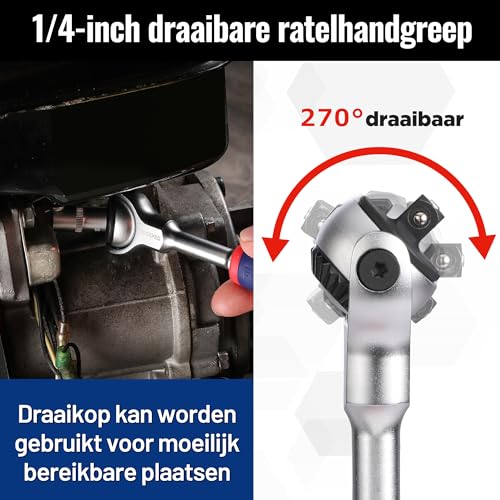 1/four” ratelhandgreep: De 1/four” ratelhandgreep is 270° draaibaar. De flexibele kop is ideaal voor gebruik in krappe ruimtes en de 1/four” ratel heeft okayeen snelspanner. Je kunt er gemakkelijk doppen mee verwisselen