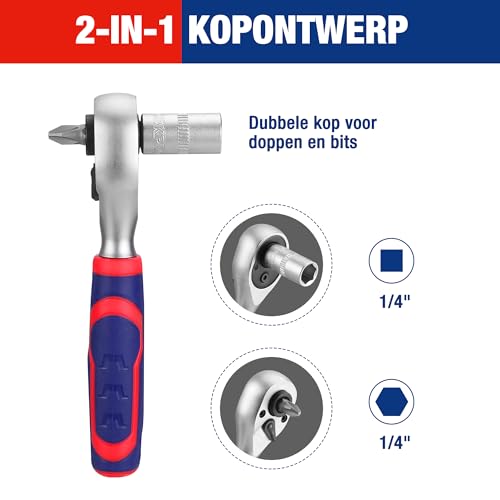 2-in-1-design veelzijdig inzetbaar: compacte ratelsleutel met een dubbele kop voor het gebruik van dopsleutels en bits. Ideaal voor diverse doe-het-zelfprojecten en precieze reparaties
