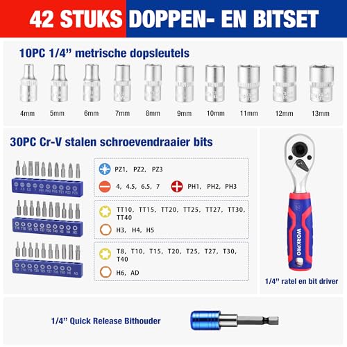 WORKPRO Gereedschapskist, 42 steeksleutelinzetstukken, 1/4 inch, ratelset met schroevendraaier en bits, ratelsleutel met 72 tanden, voor doe-het-zelvers, autoreparatie, dagelijks onderhoud