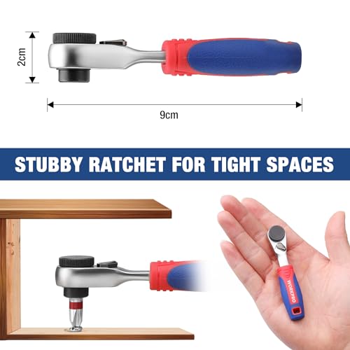 【Schroevendraaierbitset met Omkeerbare Ratel】De 9 cm lange mini omkeerbare ratel met 60 tanden werkt onder een werkhoek van 6 graden, waardoor een groter bereik mogelijk is, Superb voor krappe werkruimtes. En de omkeerhendel beweegt soepel en maakt eenvoudig wisselen tussen hyperlinks- en rechtsom draaien mogelijk.