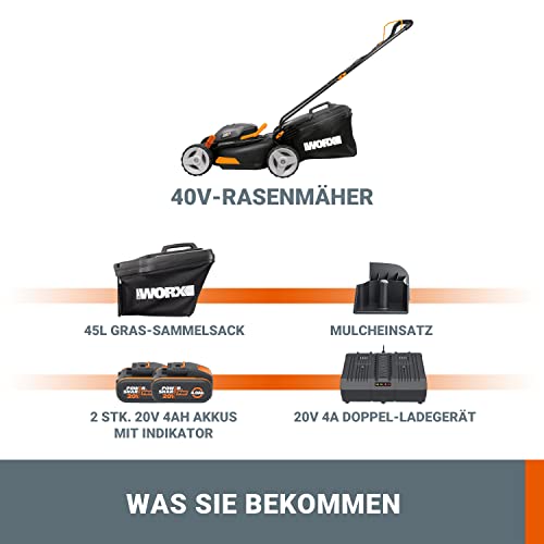 Specificaties: WORX WG743E Grasmaaier 40V Mulchfunctie PowerShare-Accu & WG163E.9 Grastrimmer 20V 2-in-1 Trimmer Randsnijder