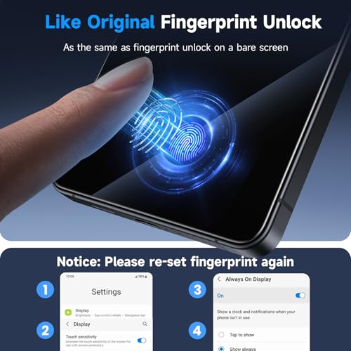 Voorkomen van vingerafdrukken: De speciale ultradunne oliebestendige coatingtechnologie kan dagelijks stof, vlekken en vingerafdrukken effectief voorkomen, zonder het normale gebruik te beïnvloeden. Dit product is compatibel met de meeste telefoonhoesjes en eenvoudig te bedienen. Voor een efficiënter ontgrendelen van vingerafdrukken, geef uw vingerafdruk opnieuw in na de installatie en bekijk zorgvuldig onze productvideo.
