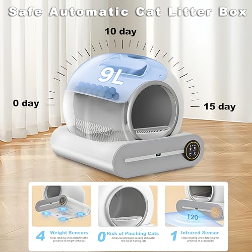 Grote capaciteit: de automatische kattenbak met grote capaciteit heeft een binnenruimte van 65 liter en een opslagcapaciteit van 9 liter. Het kan katten van 2,2 pond tot 17,6 pond opnemen en is niet geschikt voor dieren jonger dan 6 maanden.