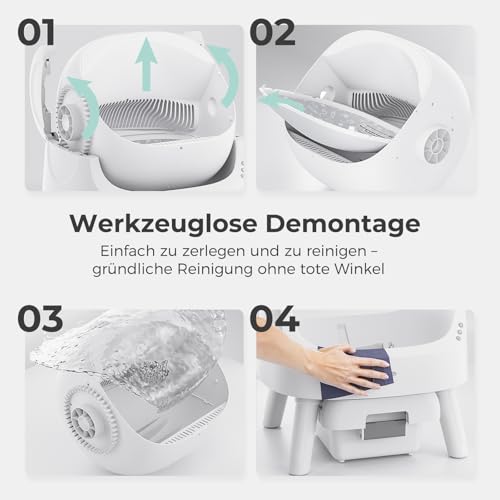 Eenvoudig onderhoud en stille bediening: de structuur van de zelfreinigende kattenbak is zo ontworpen dat de montage en demontage zonder gereedschap kan worden uitgevoerd. Tijdens bedrijf is het amount niet groter dan 32 dB, wat de kat niet bang maakt of het dagelijks werk of leven beïnvloedt.